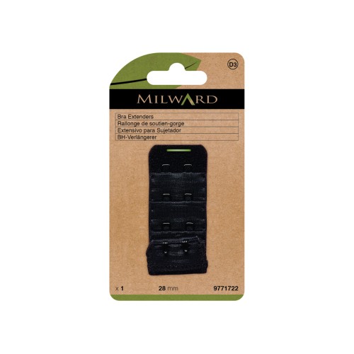 **Is je favoriete bh net iets te strak? Met dit zwarte bh verlengstuk zit je weer goed.** Dit comfortabele verlengstuk van 28mm is voorzien van 2 haakjes met 3 verstelstanden. Gemaakt door Milward en geleverd in een plasticvrije verpakking.