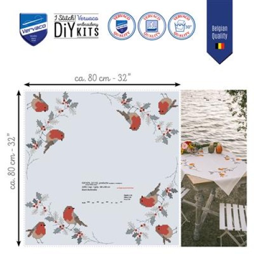 Tags: vervaco borduurpakket, tafelkleed borduren, voorbedrukt tafelkleed, roodborstjes borduren, vogels borduren, kruissteek, steelsteek, stiksteek, DMC garen, geconfectioneerd, complete set, borduurstof, matig gemakkelijk, 9 kleuren borduren