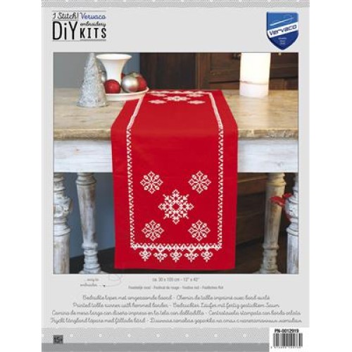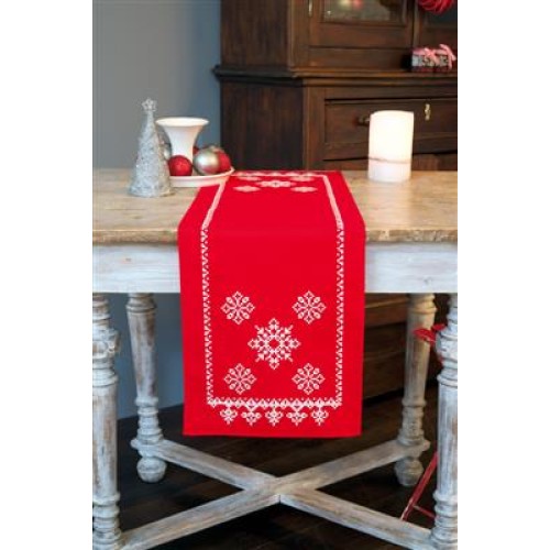 Creëer zelf een warme, feestelijke sfeer met dit **rode** **Vervaco tafelloper** borduurpakket! Deze **geconfectioneerde tafelloper** (ca. 30 x 105 cm) is gemaakt van 100% katoenen **borduurstof** en voorzien van een nette omgezoomde boord. De stof is bedrukt met **uitwasbare verf** en speciaal ontworpen om uitsluitend de **kruissteek** te gebruiken. Dit **voorbedrukt borduurpakket** is hierdoor **zeer gemakkelijk** in moeilijkheidsgraad.