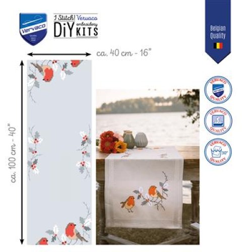Tags: vervaco borduurpakket, tafelloper borduren, voorbedrukt tafelloper, roodborstjes borduren, vogels borduren, kruissteek, steelsteek, stiksteek, DMC garen, geconfectioneerd, complete set, borduurstof, matig gemakkelijk, 9 kleuren borduren, loper kit