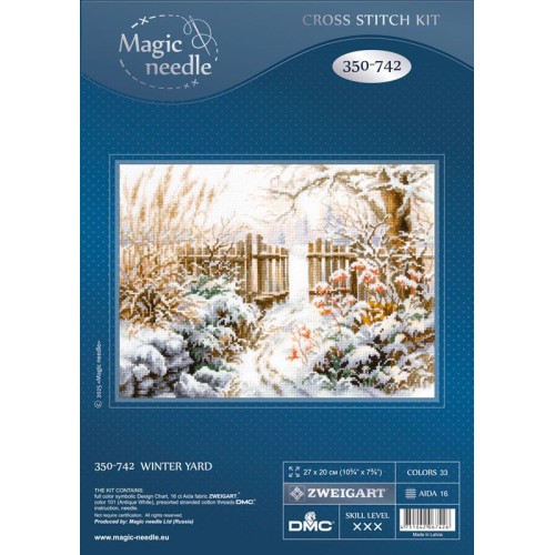 Creëer een charmant en sfeervol **winterlandschap** met dit gedetailleerde **Magic Needle borduurpakket** 'Winter Yard'! Dit complete **kruissteekpakket** (27 x 20 cm) is ideaal voor liefhebbers van **Landschappen**. De set bevat alle **fournituren**: **voorgesorteerde borduurgarens**, **DMC 6-draads garen** in maar liefst **33 kleuren** en **Zweigart Aida stof** (16 count, antiek wit). Dit **zelf borduren pakket** is van hoge kwaliteit en is een ontspannend project voor de ervaren hobbyist.